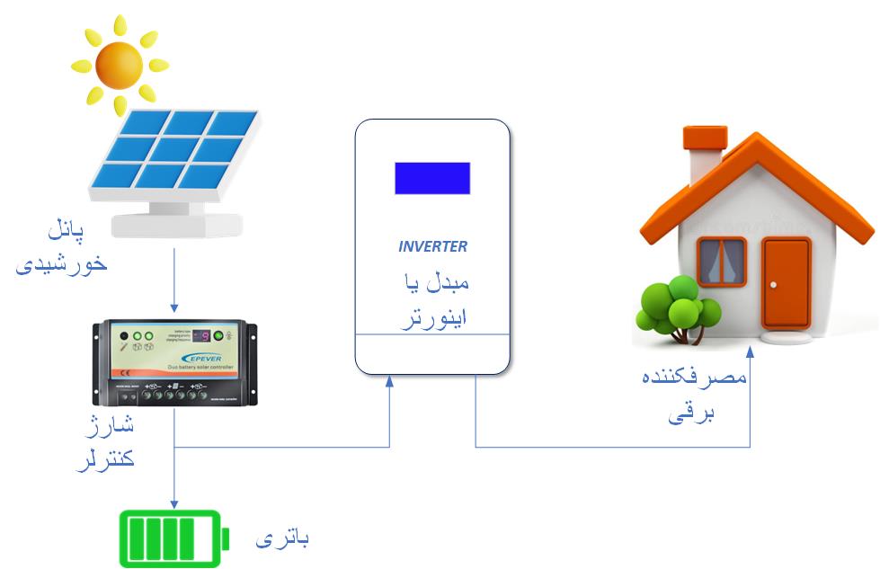 تفاوت اساسی اینورترهای جدا از شبکه با اینورترهای متصل به شبکه در این است که در این سیستم دیگر نمیتوان برق تولیدشده را به شبکه توزیع تزریق کرد و آنرا فروخت.